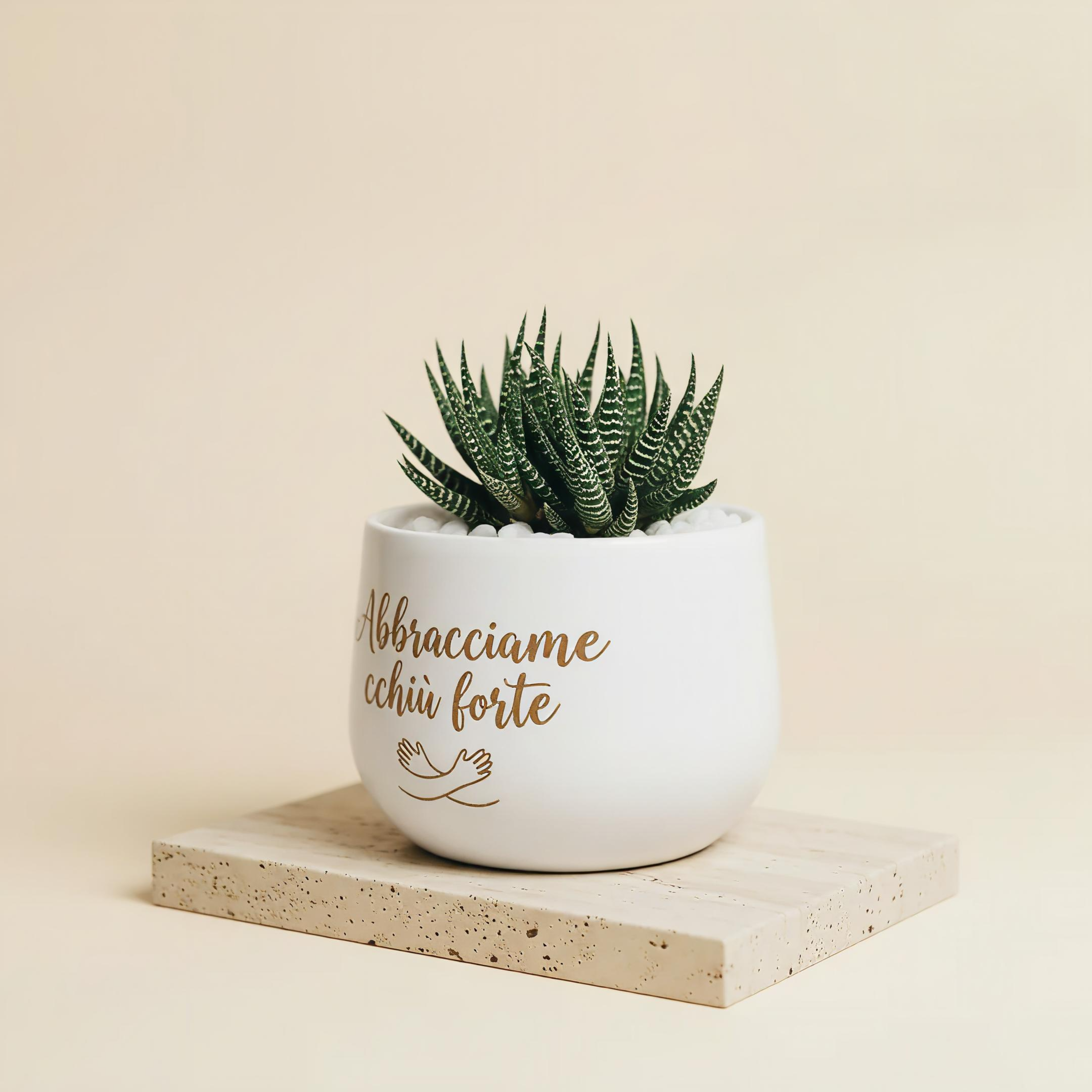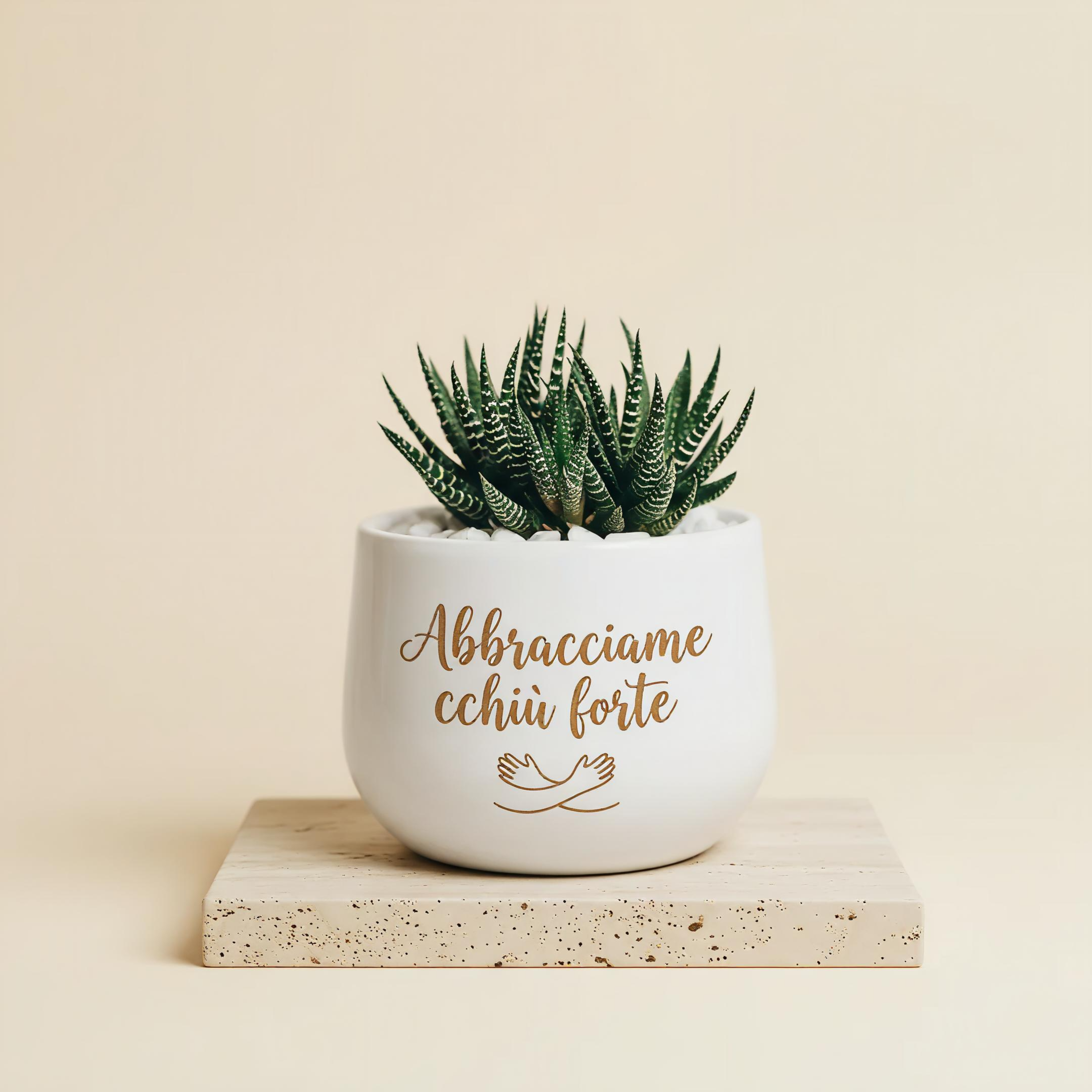 Un vaso che parla direttamente al cuore, in dialetto e con tutta la sua intensità: “Abbracciame cchiù forte”. La piantina vera diventa il simbolo di un affetto che stringe forte, che ti fa sentire al sicuro e a casa. Un’idea perfetta per chi ama Napoli, il Sud e i gesti pieni di calore.