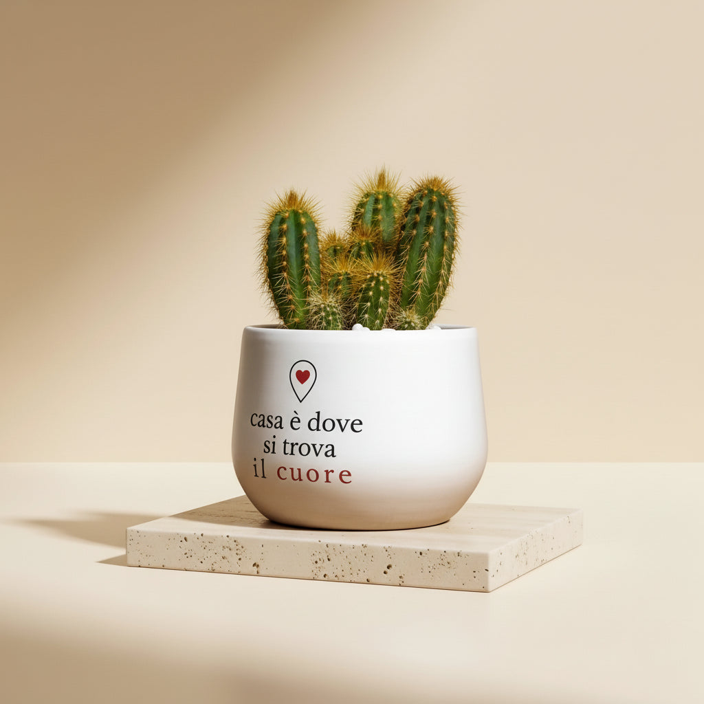 La frase perfetta per chi ama le piccole cose che scaldano l’ambiente. Un vasetto in ceramica con piantina vera e un messaggio che parla di casa, di affetto e di presenza: semplice, elegante, sempre giusto.